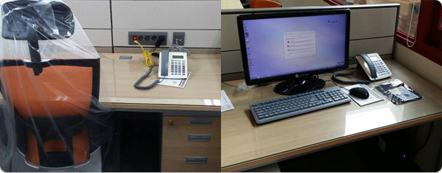 구조변경 없이 책상 배치를 하는 경우 입니다. 중소형 사무실 대부분의 경우 이며, 책상 수가 대단히 많은 경우가 아니 라면 하루만에 시공은 완료가 됩니다. 신규 사무실 개업의 경우 책상 배치가 완료된 이후에, 사무실 이사의 경우 이삿날에 시공을 해주고 있습니다. 시공후 PC와 연결 마무리후 네트워크 점검을 실시 합니다.