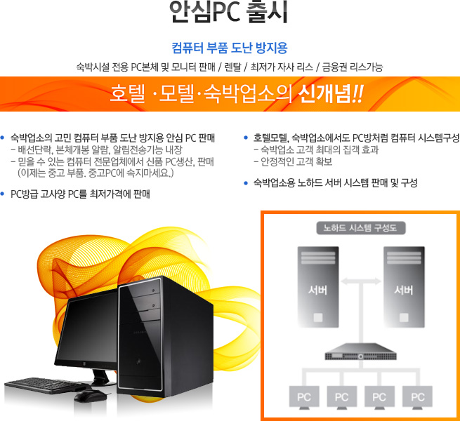 - PC에 하드디스크가 없이 서버에 접속하여 부팅 및 운용하는 시스템으로 PC 프로그램 미설치로 고장율 없이 각룸에서 PC방급의 성능으로 컴퓨터 사용가능 및 분실방지를 위한 전용케이스, 와이어 설치 (실사후 견적가 제출합니다)